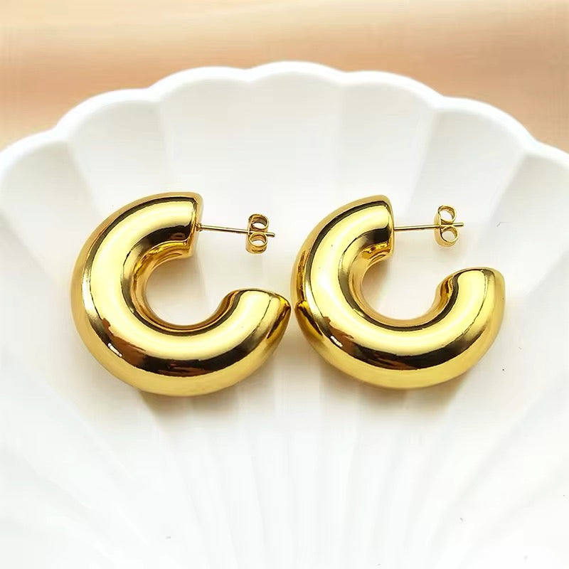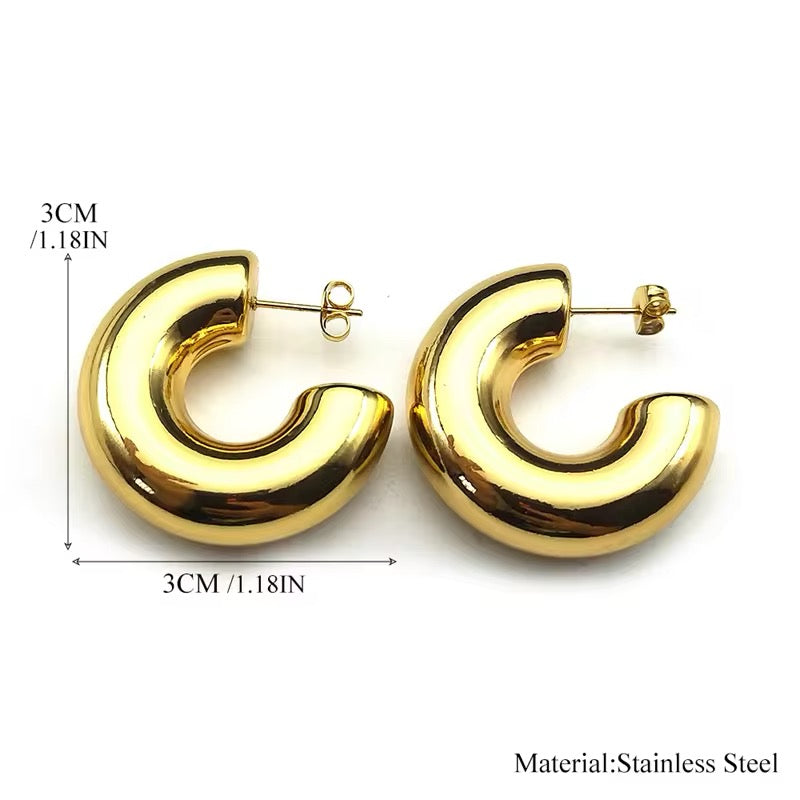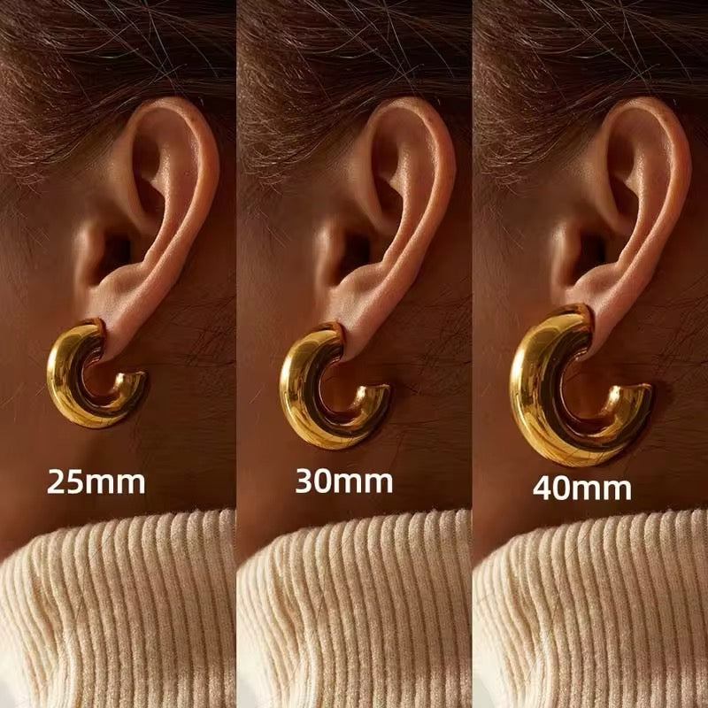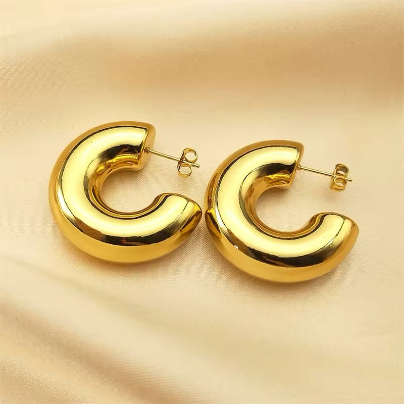 arracada gruesa lisa en forma de C de acero inoxidable. Diseño tipo huggies brillantes y pulidos