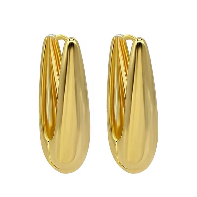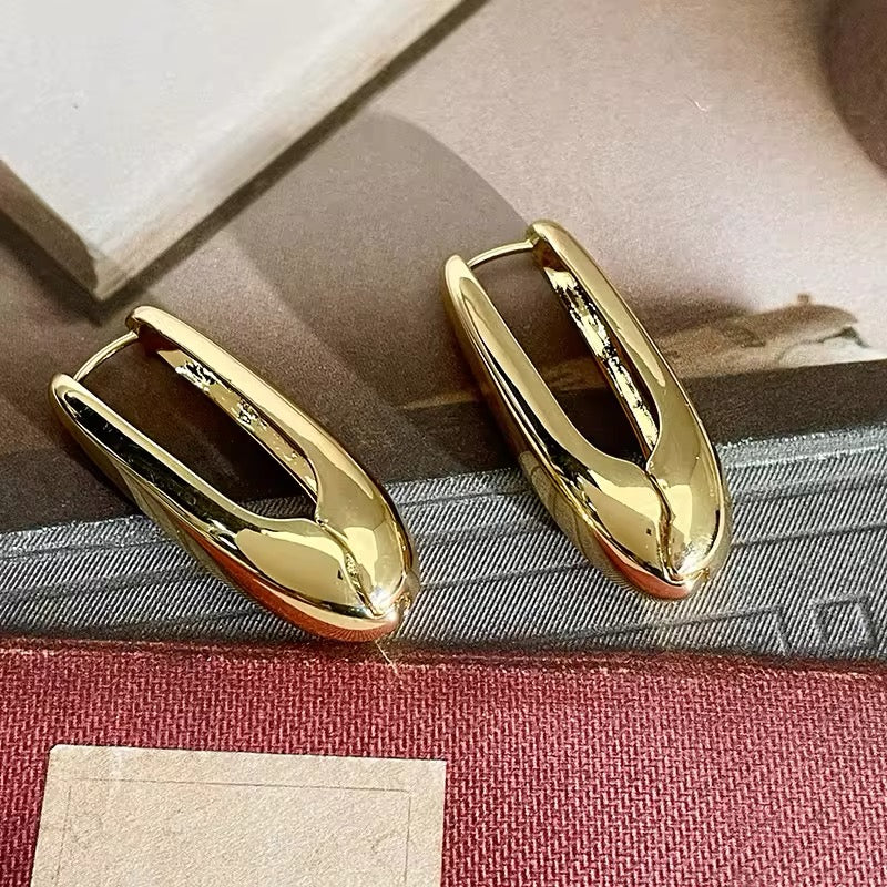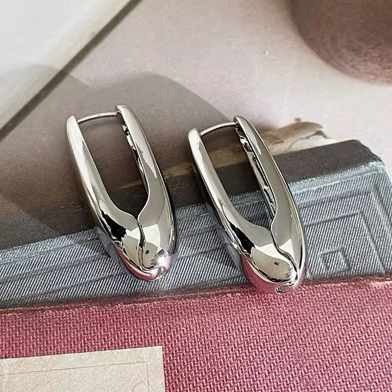 Pendiente largo estilizado en forma de pinza. Metalico pulido de espejo. Broche de clip.