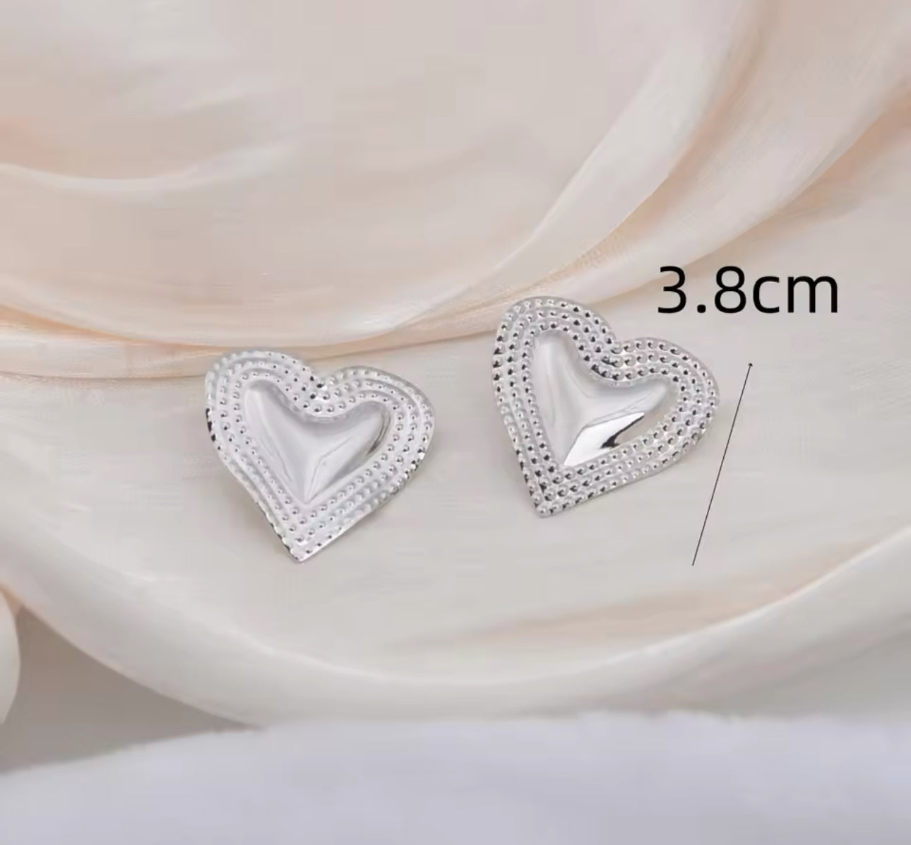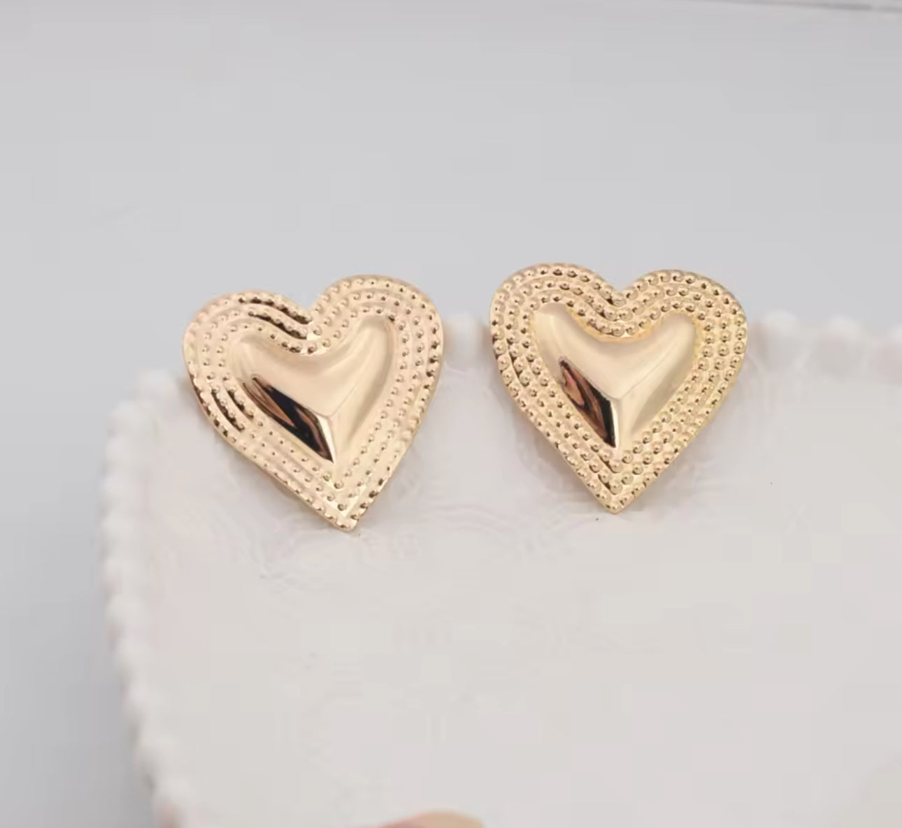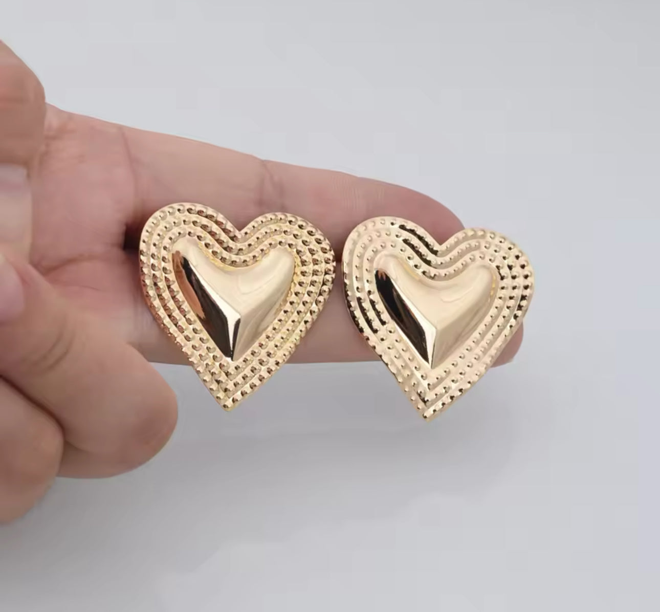Aretes de lujo labrados por fuera y lisos por dentro. Corazón metálico grande tejido bañado en oro. Un diseño moderno y único.