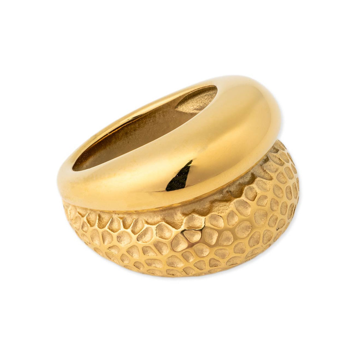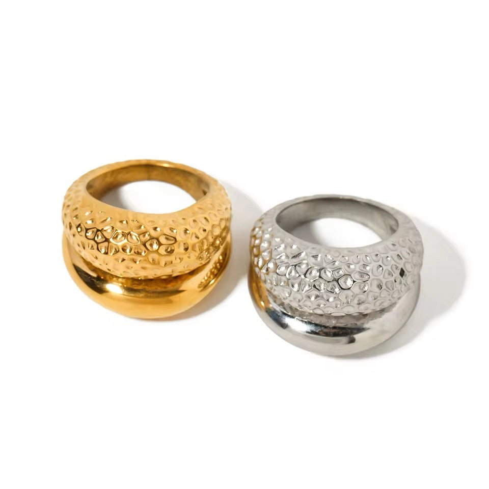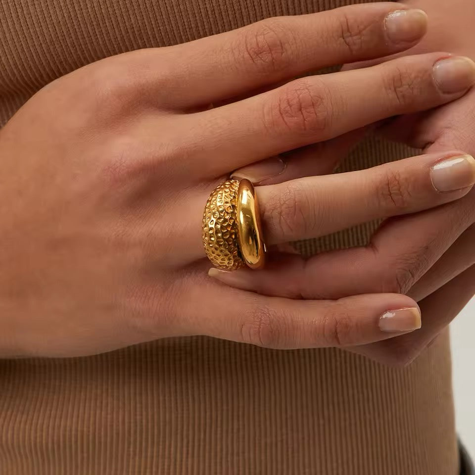 Anillo grande con doble curva, martelinada y lisa.