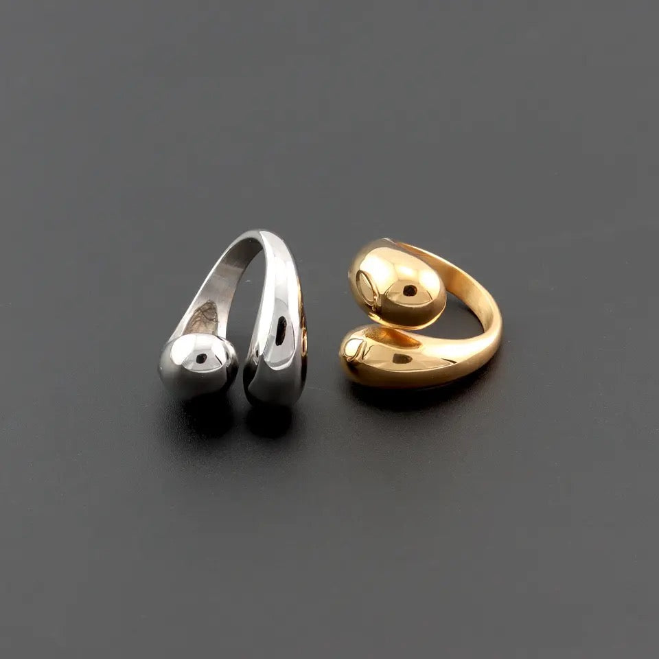 Anillo de acero inoxidable con diseño en forma de gotas encontradas.