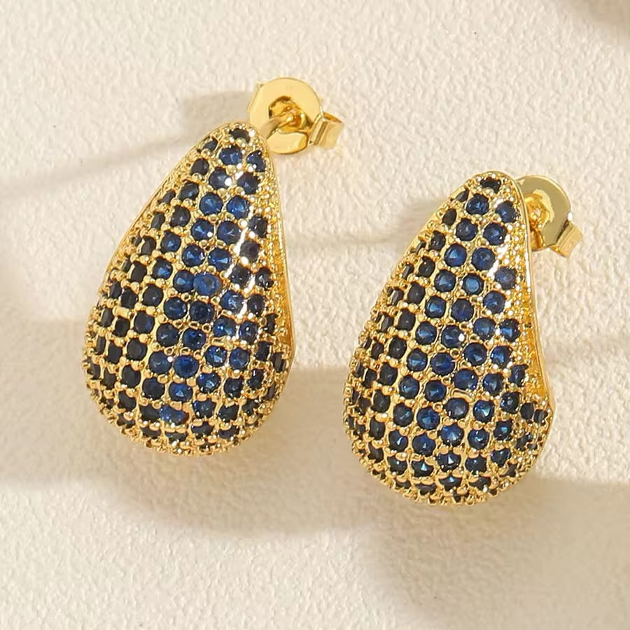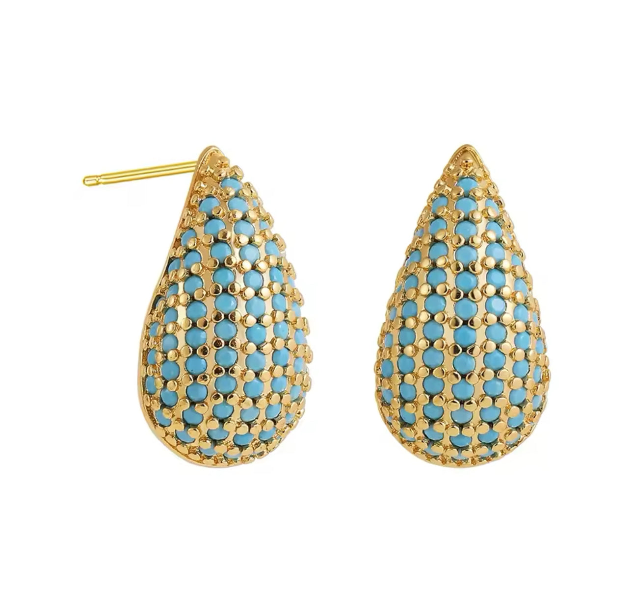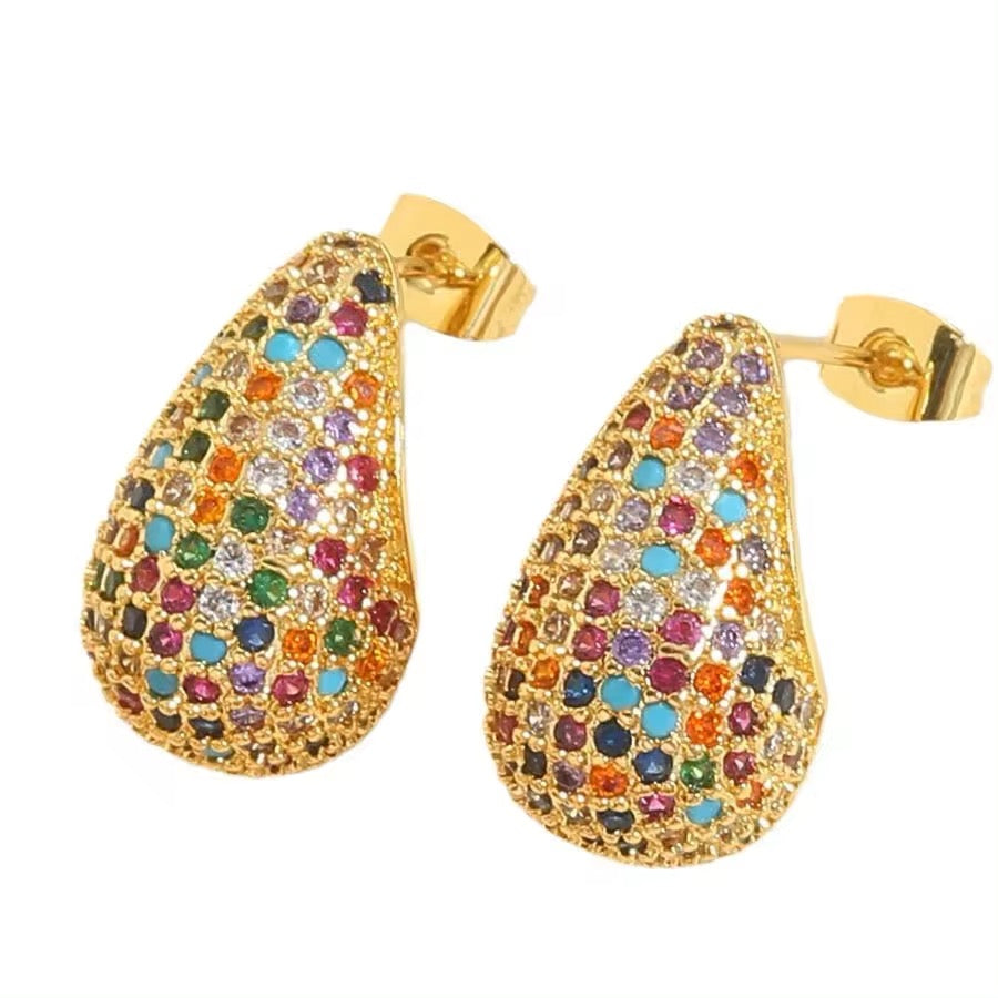 Aretes metálicos en forma de gota chica con incrustacion de cristales de colores. Broche de poste con mariposa.