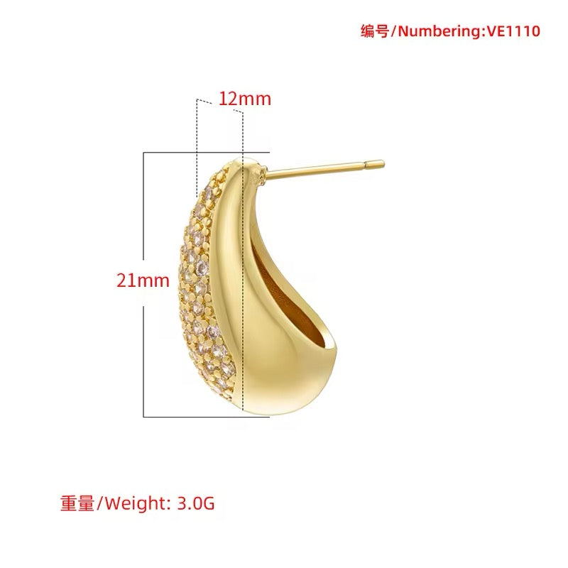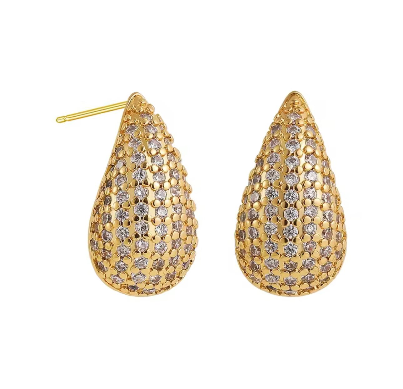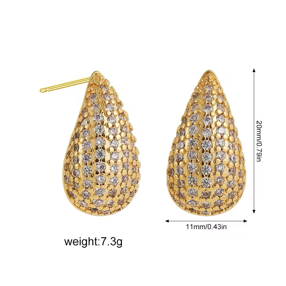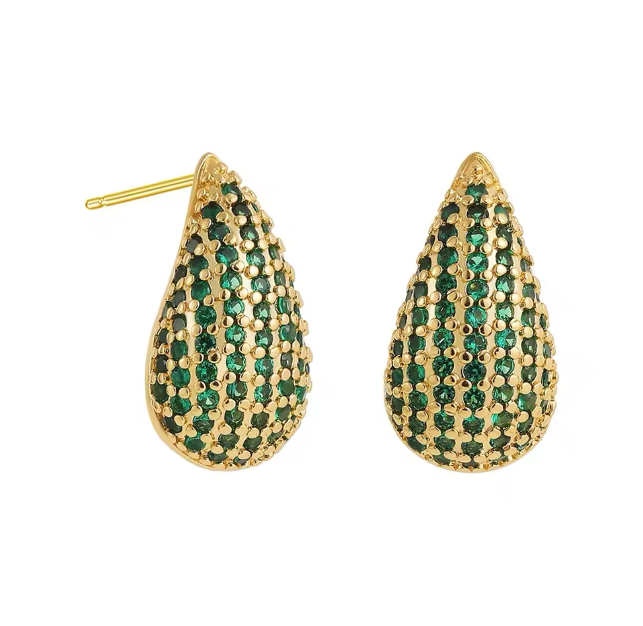 Aretes metálicos en forma de gota chica con incrustacion de cristales de colores. Broche de poste con mariposa.