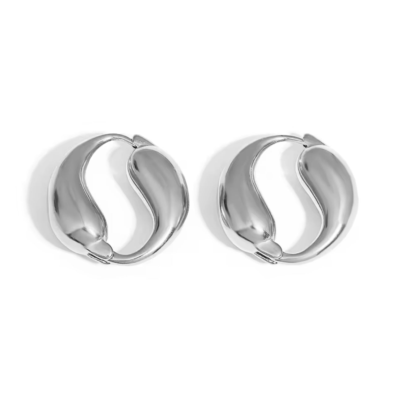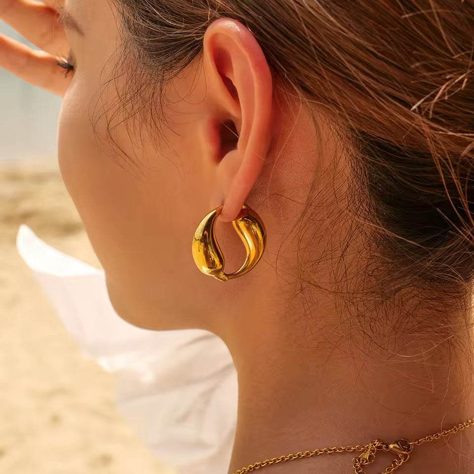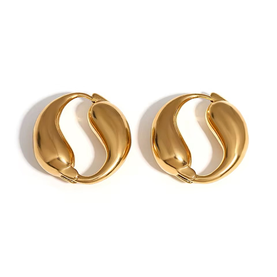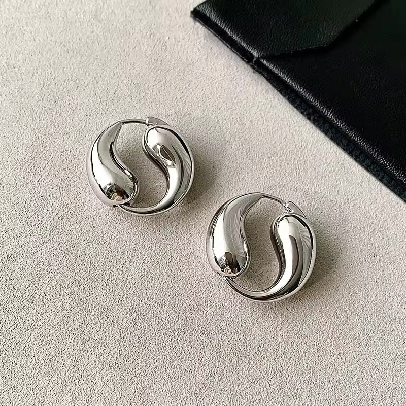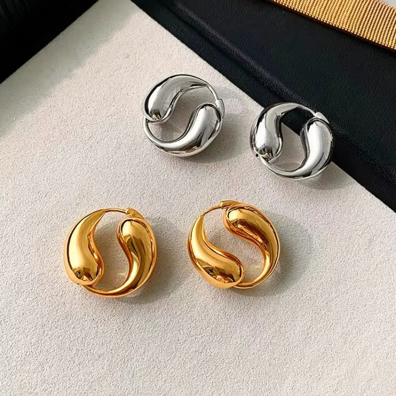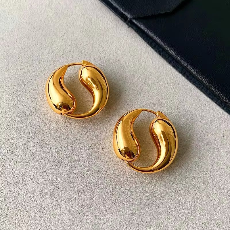 Aretes en forma de gotas estilizadas encontradas por ambos extremos. Broche firme y grueso tipo catalán.