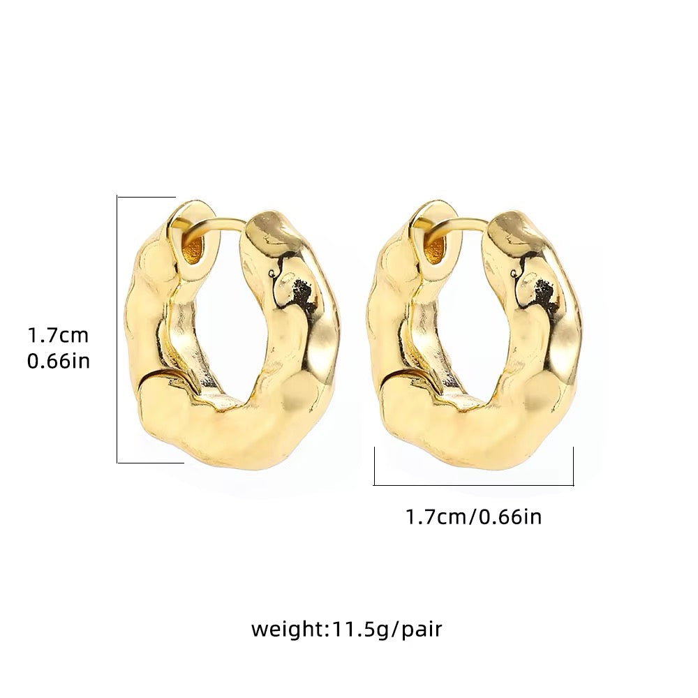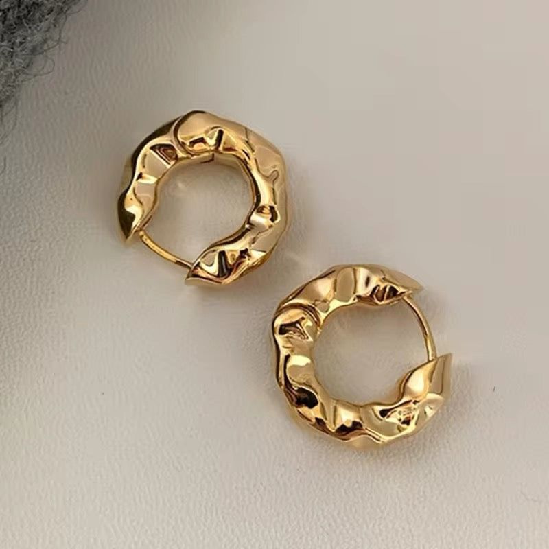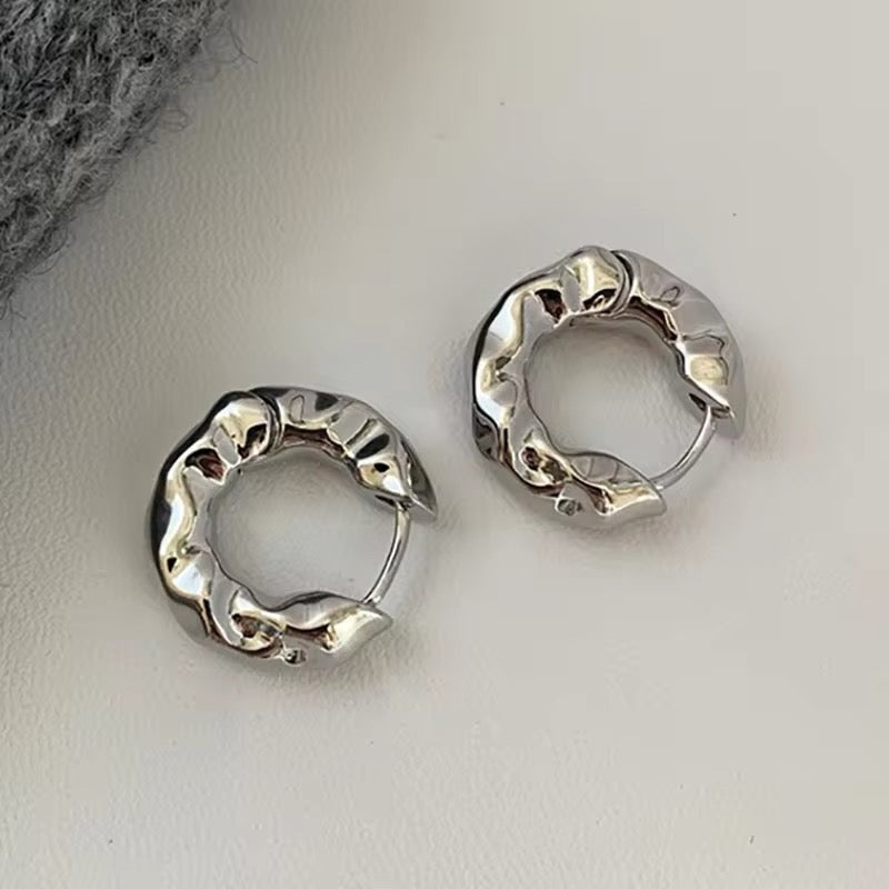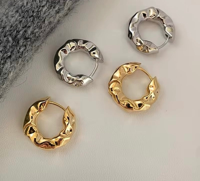 Aros medianos metalicos con pulido brillante. Diseño moderno con abolladuras. Broche de poste con mariposa.