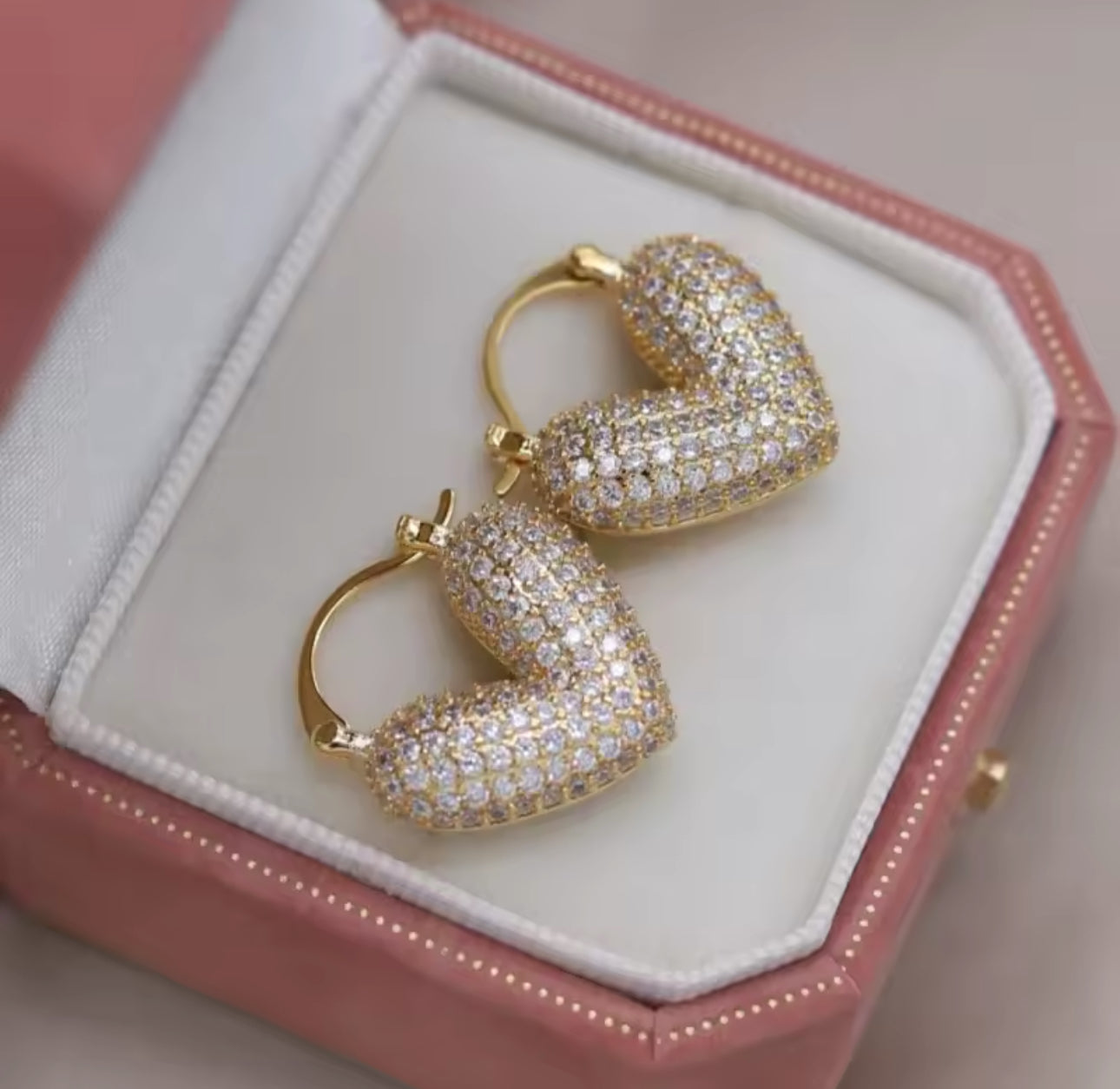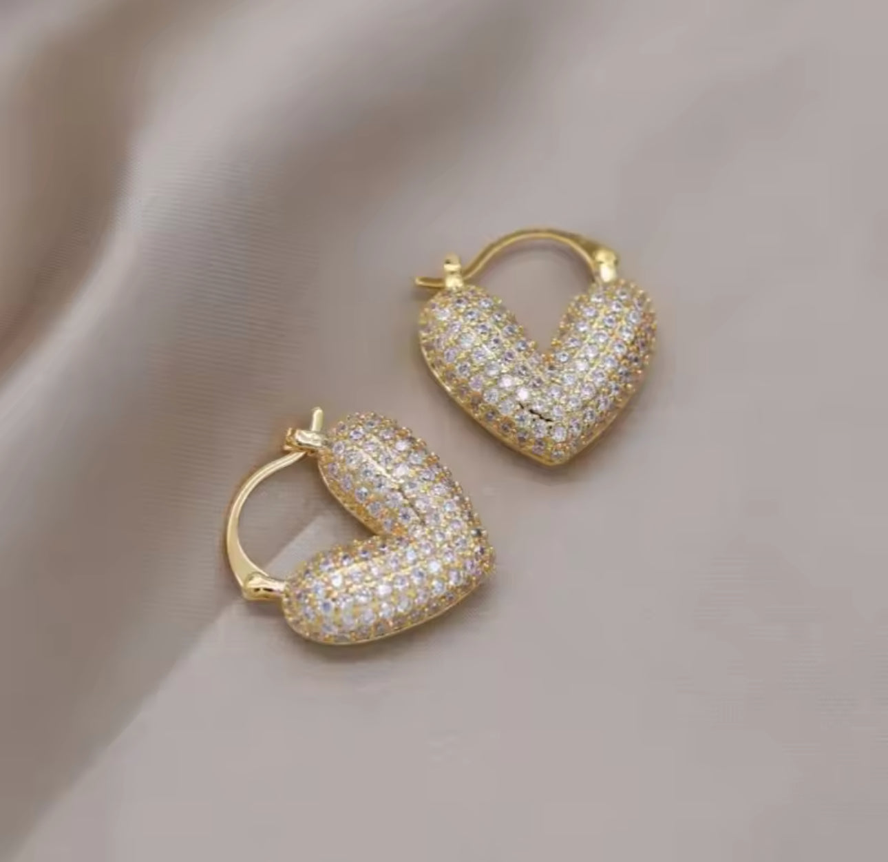Huggies elegantes en forma de corazoncitos con circonías. Perfectos para un look de noche. Broche catalán.
