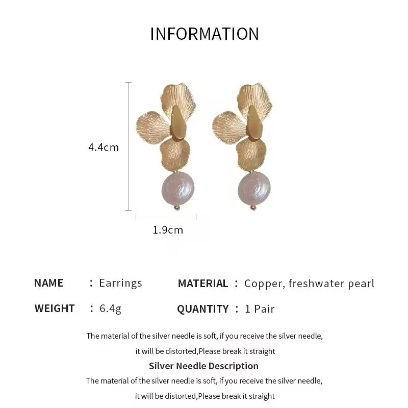 Pendientes elegantes de perlas naturales de agua dulce. Diseño en forma de petalos de flor dorado mate con perla.
