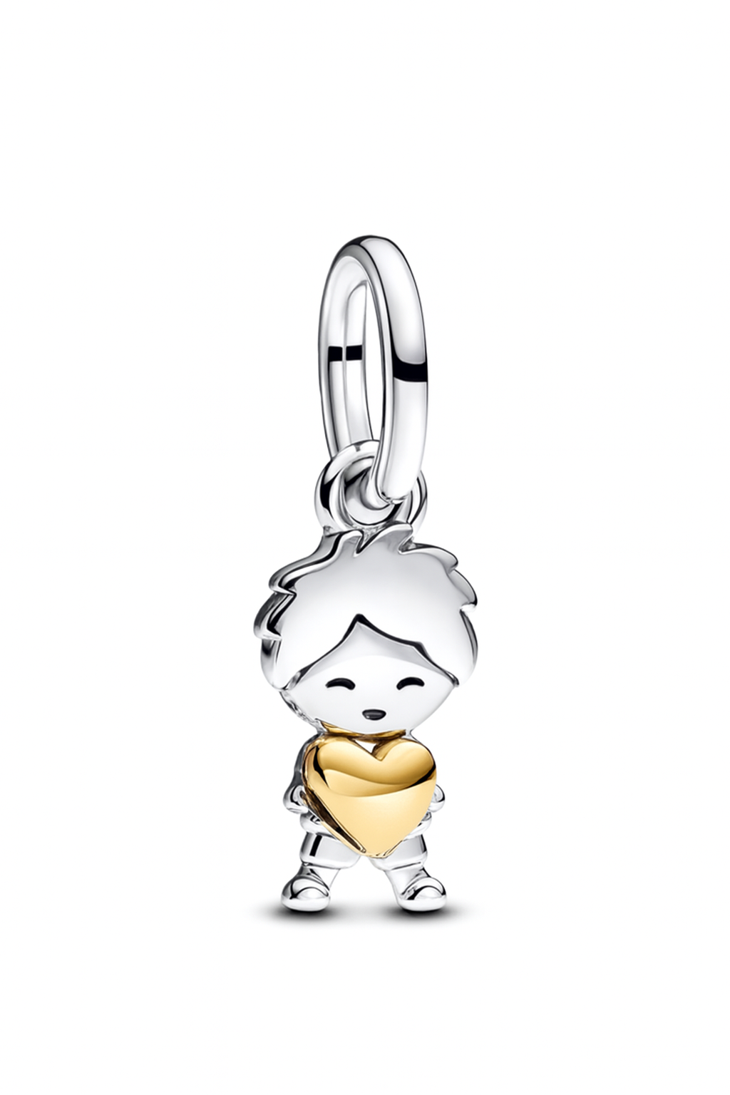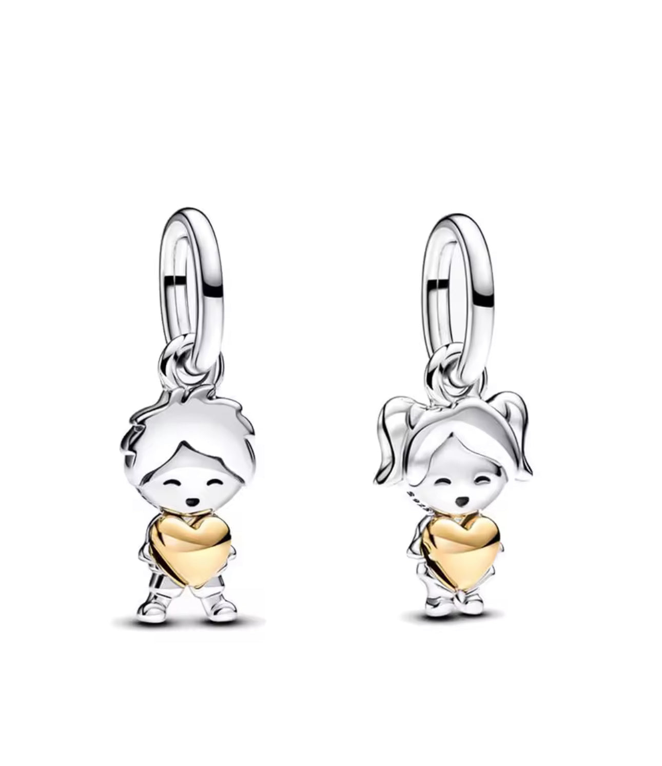 Dije de acero inoxidable en forma de niño y niña plateados con corazón dorado.