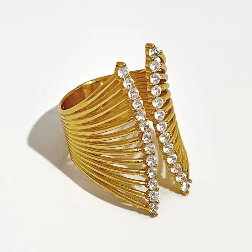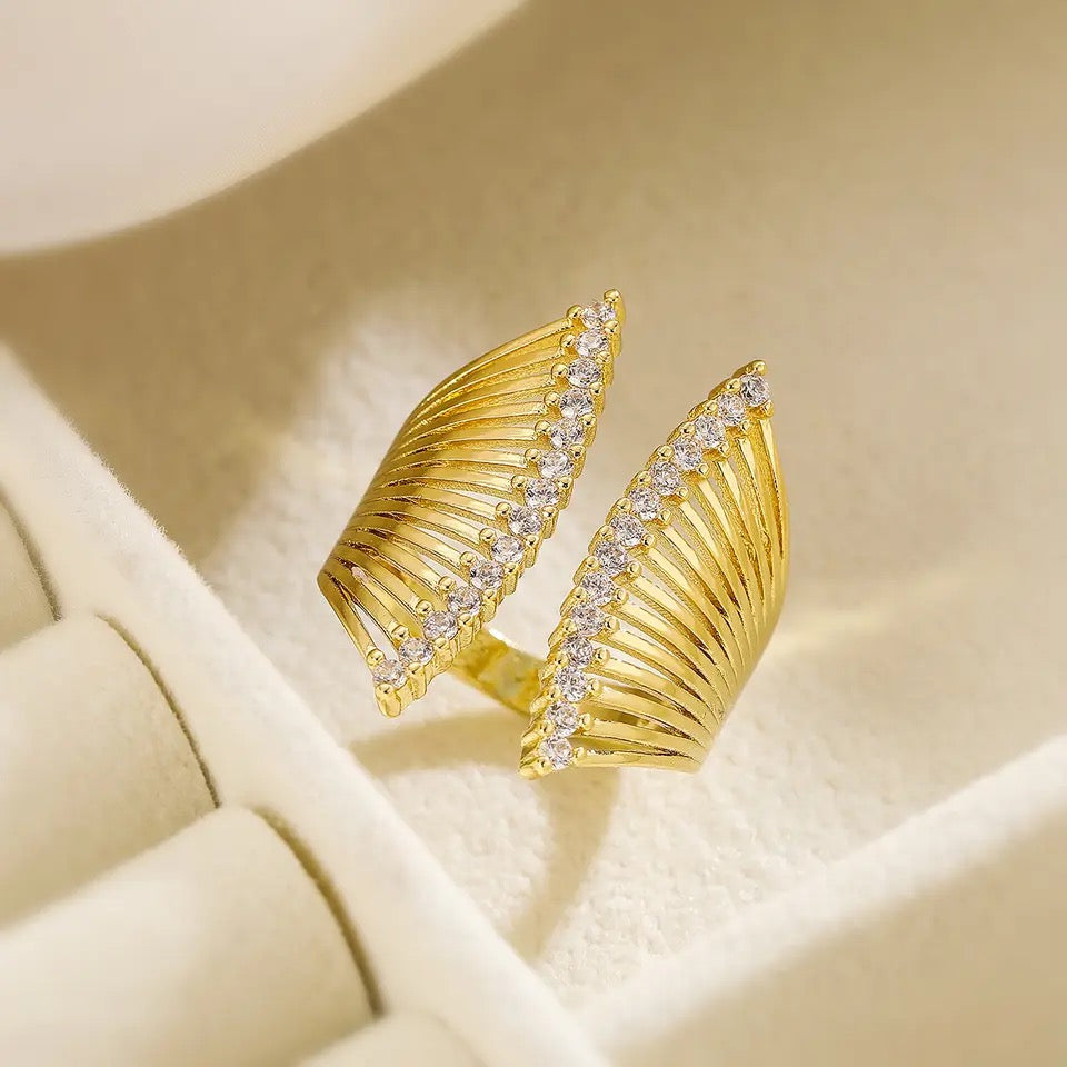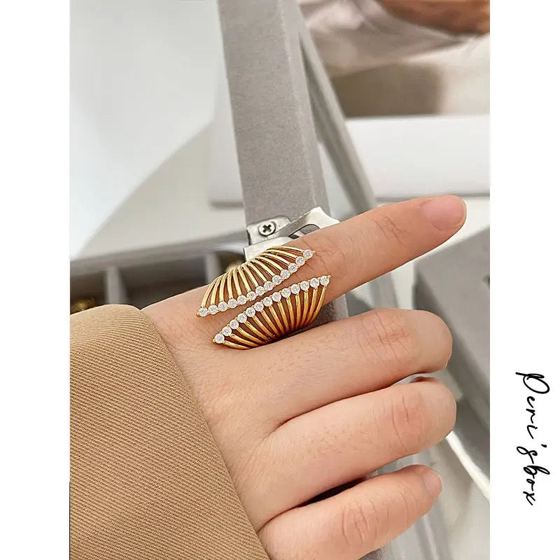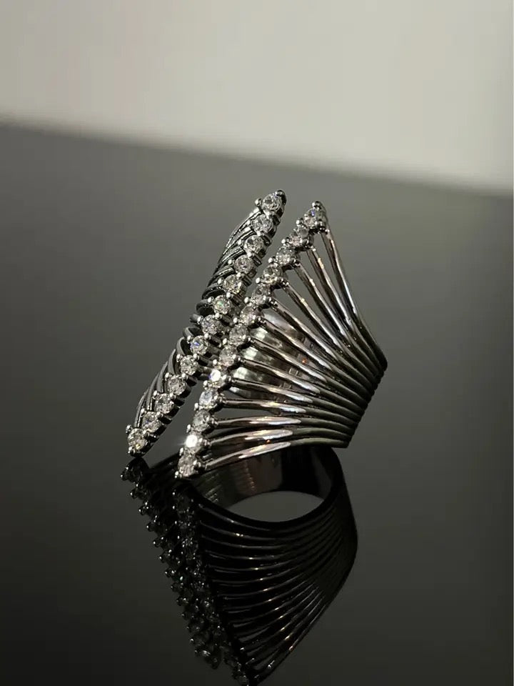Anillo abierto por el frente con forma de alas rayadas terminadas con decoración de circonias en la punta.