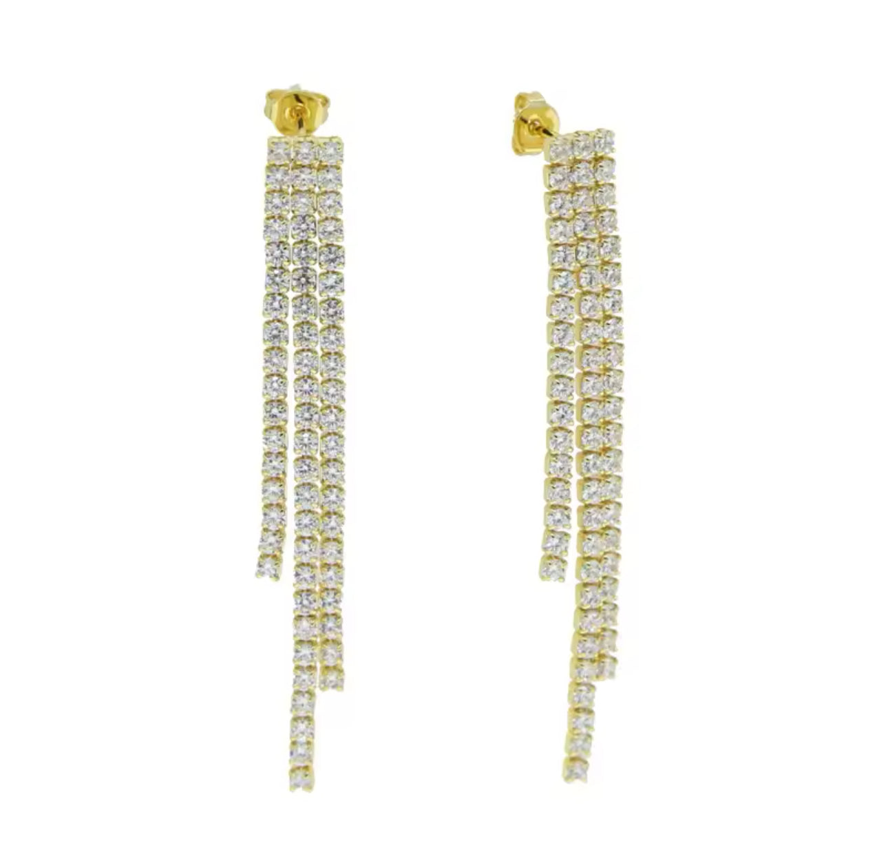Aretes de 3 tiras largas de circonia cubica montadas en base de acero. Broche de poste con mariposa.